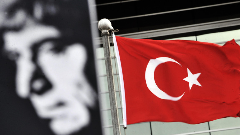 A poster bearing a picture of Hrant Dink is pictured in front of an Istanbul counrthouse. Dec. 3, 2013. (Photo: AFP)