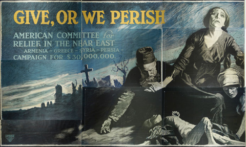 The largest poster is a massive 9- by 14-foot American work urging people to “Give, or we Perish,” that was made on behalf of the Armenian Relief Fund.