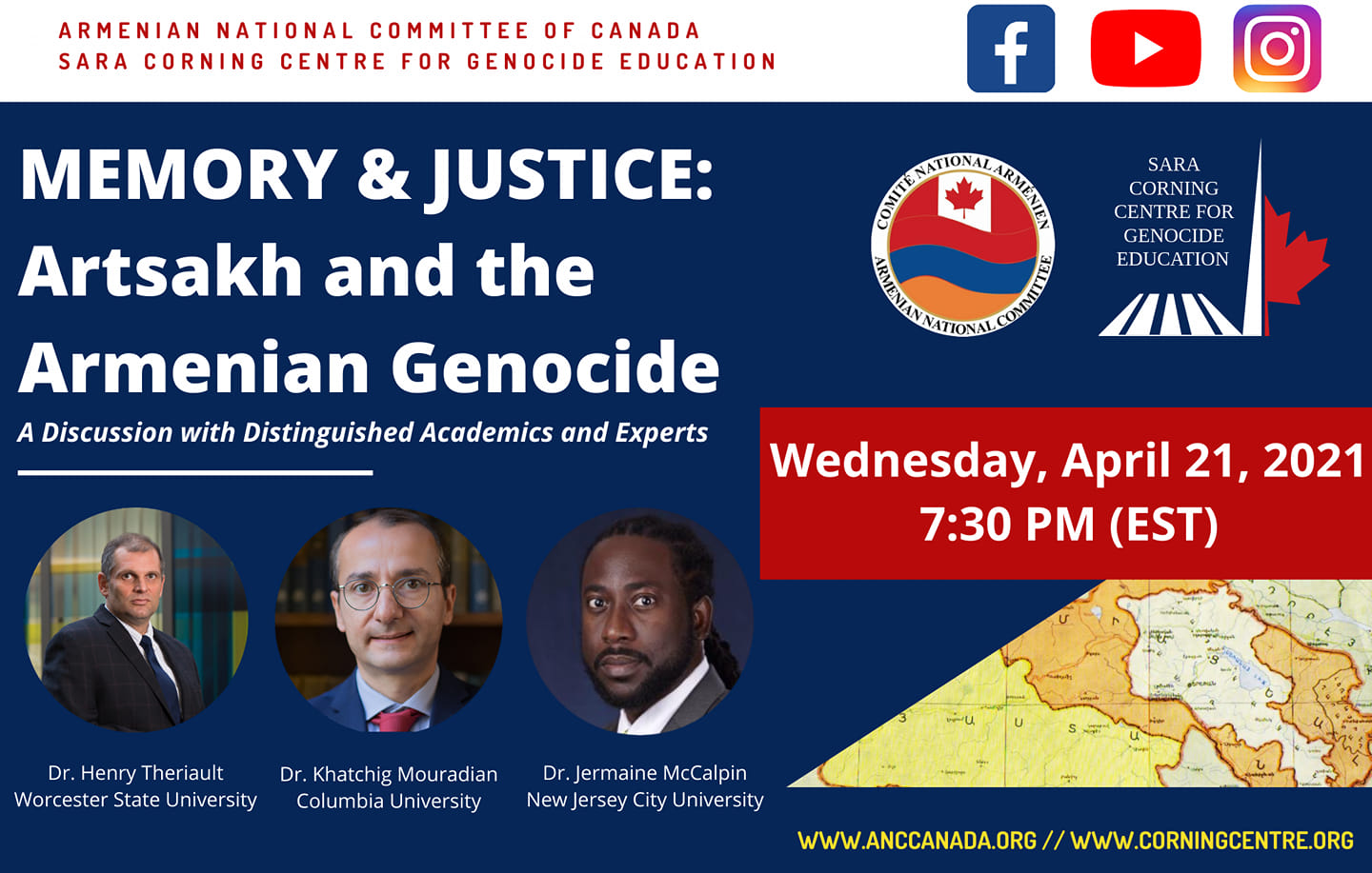 Գանատայի Հայ Դատի յանձնախումբի եւ Սառա Գորնինկ ցեղասպանութեան ուսուցման կեդրոնի կազմակերպութեամբ, Ապրիլ 21-ին կը կայանայ առցանց լսարան «Յիշողութիւն եւ արդարութիւն. Արցախը եւ Հայոց Ցեղասպանութիւնը» խորագրով։