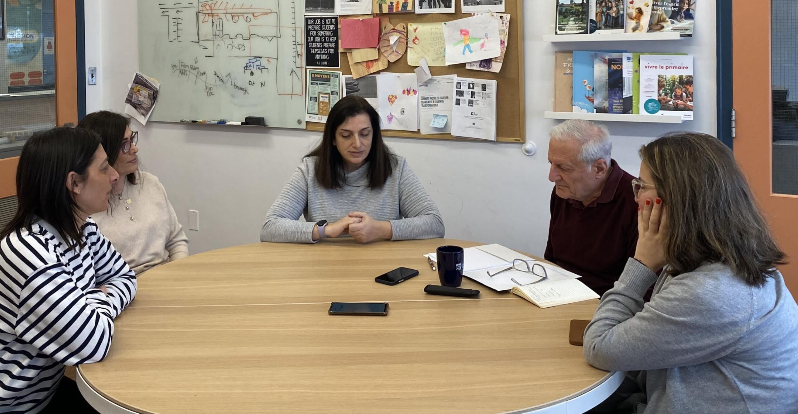 Հորիզոնի կլոր սեղանին շուրջ, բայց տնօրէնուհիին գրասենեակին մէջ, զրոյցին կը մասնակցին ինքը՝ տնօրէնուհին՝ Լորի Ապրաքեանը, մանկապարտէզի Ծաղիկ դասարանի ուսուցչուհի Սոնիա Բաբախեան-Գուզուճեանը (որ ՍՅԱՎ-ի շրջանաւարտ է), նախակրթարանի Գ. եւ Դ. կարգերու ուսուցչուհի Զեփիւռ Հաճեան-Ասատուրեանը եւ երկրորդականի ուսուցչուհի Լորիկ Սապունճեան-Ծատուրեանը,, երեքն ալ հայերէնի դաշտին մէջ։