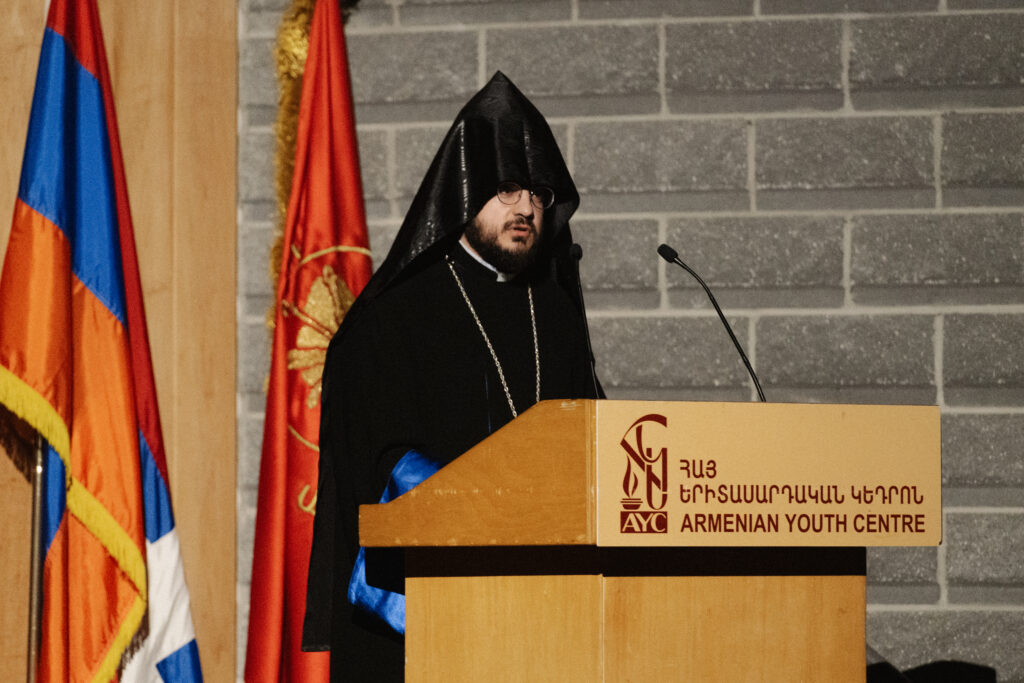 Թորոնթոյի Ս. Աստուածածին Հայց. Առաք. եկեղեցւոյ հոգեւոր տեսուչ Հոգշ. Տէր Գարեգին Ծ. Վրդ. Շխրտմեան իր ելոյթին մէջ ըսաւ․ «Այսօր տօնն է պահանջատէր հայուն։ Տօնն է այն հայուն, որ իր գոյութեան համար խիզախօրէն կը պայքարի, անարդարութեան դիմաց անզիջող կը մնայ, նահանջել չի գիտեր եւ չի թոյլատրեր, որ իր ժողովուրդը նահանջէ։ Այսօր տօնն է Հայաստանի, Արցախի, արցախահայութեան եւ աշխարհասփիւռ հայութեան համար տագնապող ազնուական հոգիին»։ Հայր Սուրբը նաեւ փոխանցեց Գանատայի Հայոց Թեմի առաջնորդ Գերշ. Տ. Բաբգէն Սրբ. Արք. Չարեանի հայրական օրհնութիւնը, ջերմ շնորհաւորանքներն ու բարեմաղթութիւնները։ Ապա հոգեւոր հայրերուն Տէրունական աղօթքով կատարուեցաւ տօնակատարութեան բացումը։