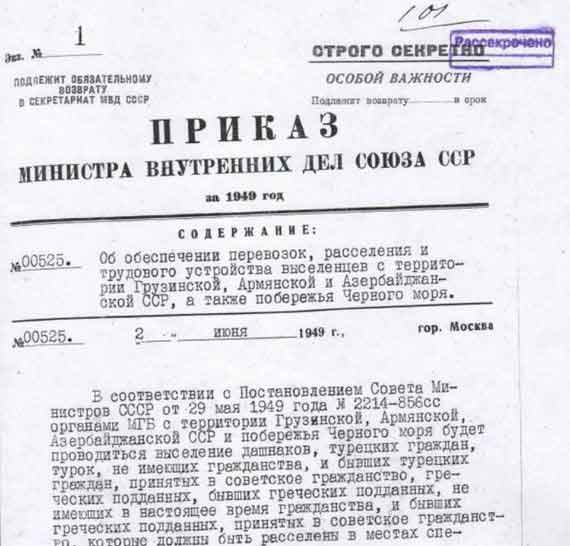 Պետական անվտանգութեան նախարարութիւնը 28 մայիս 1949-ին հրահանգեց, իսկ յաջորդ օր Խորհրդային Միութեան նախարարաց խորհուրդը` Ստալինի ստորագրութեամբ ընդունեց թիւ 2214-856 գաղտնի որոշումը` «Վրացական, Հայկական եւ Ազրպէյճանական խորհրդային հանրապետութիւններէն, ինչպէս նաեւ Սեւ ծովու առափնեայ տարածքներէն աքսորուողներու տեղափոխութեան, վերաբնակեցման եւ աշխատանքի տեղաւորման մասին»: