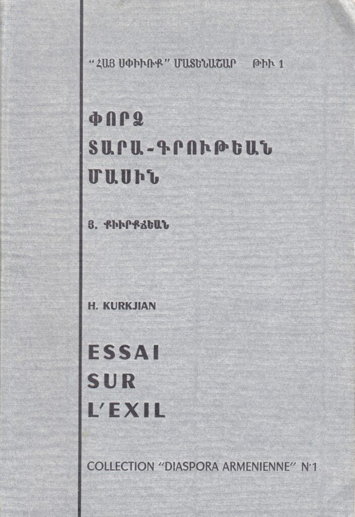 Սփիւռքահայ հոգեկան կառոյցին ծննդաբանութիւնը եւ վերլուծումը, անկասկած՝ միաժամանակ ծննդաբանութիւնն է եւ վերլուծումը սփիւռքահայ ինքնութեան։ Ասոր գալէ առաջ յաջորդ յօդուածով, ակնարկ մը՝ իր կողմէ սահմանուած Սփիւռքի ժամանակագրական հանգրուաններուն մասին («Սփիւռքահայ Գրականութիւնը՝ Ժառանգորդ Արեւմտահայ Գրականութեան»)։