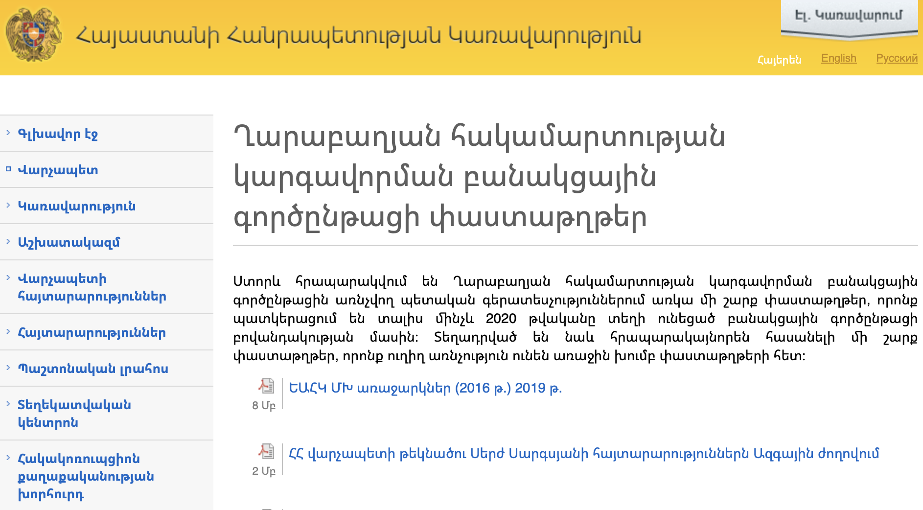 Հայաստանի Հանրապետութեան կառավարութեան կայքին վրայ հրապարակուեցան Արցախի հակամարտութեան կարգաւորման բանակցային գործընթացին վերաբերող պետական գերատեսչութիւններուն մօտ գտնուող շարք մը փաստաթուղթեր: