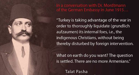 “Turkey is taking advantage of the war in order to thoroughly liquidate (grundlich aufzaumen) its internal foes, i.e., the indigenous Christians, without being thereby disturbed by foreign intervention. What on earth do you want? The question is settled. There are no more Armenians”. Talat Pasha