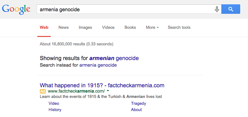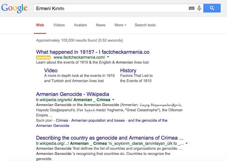 If you use Google Turkey to search for “Ermeni Kırımı”, which means “Armenian genocide” in Turkish, the first thing you’ll see is a sponsored link to a website whose purpose is to deny there was any genocide at all. If you Google “Armenia genocide” in the US, you’ll see the same thing.