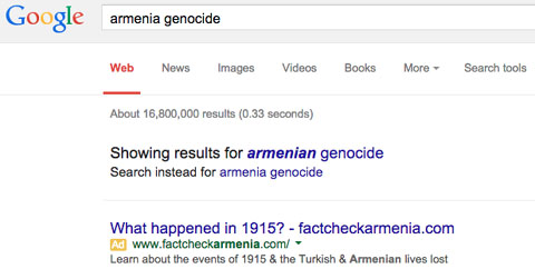 If you use Google Turkey to search for “Ermeni Kırımı”, which means “Armenian genocide” in Turkish, the first thing you’ll see is a sponsored link to a website whose purpose is to deny there was any genocide at all. If you Google “Armenia genocide” in the US, you’ll see the same thing.