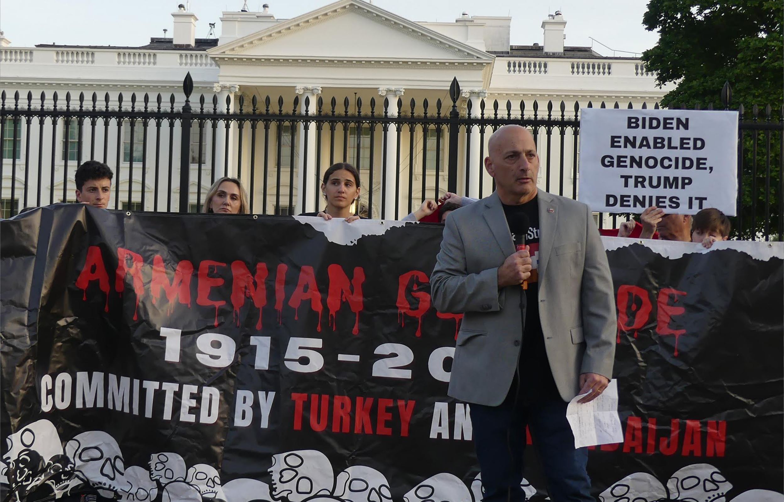At the Armenian Youth Federation (AYF-YOARF) March for Justice White House rally, ANCA Chairman George Aghjayan spoke powerfully about the continuous nature of the Armenian Genocide and the current threat to the Armenian people.  “What we’re talking about today is not two genocides, it is one continuous genocide begun 110 years ago and continuing to this day. If you have walked on the lands of our people, you have seen the destruction that has continued on our cultural heritage, the discrimination and pain caused to the Armenians who still live on those lands. And you understand that what happened in Artsakh is part of a plan begun 110 years ago by Talaat Pasha. Today’s Turkey and Azerbaijan are carrying out the exact same plan.”