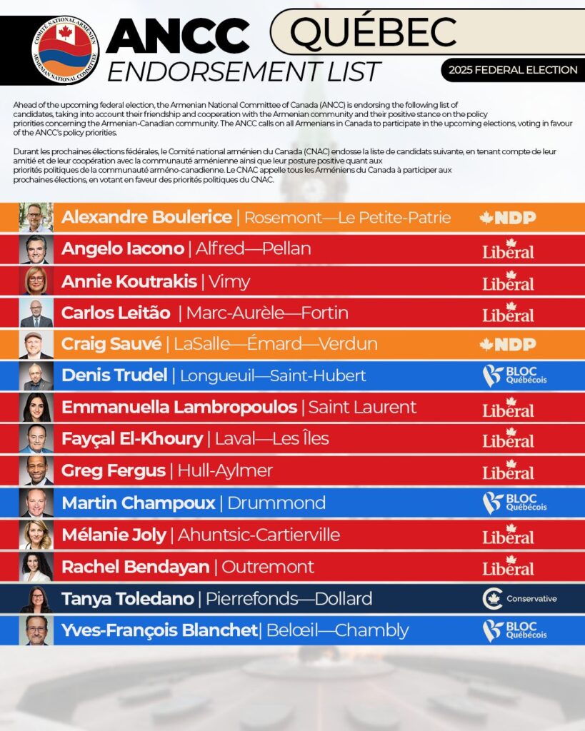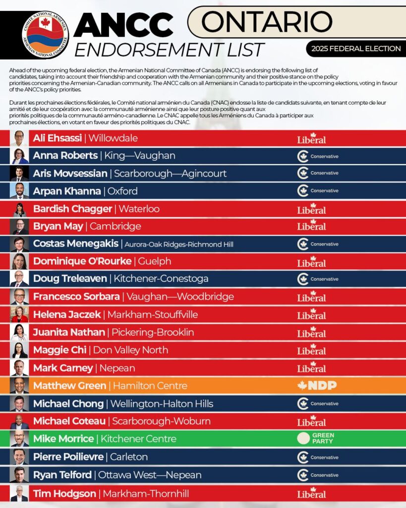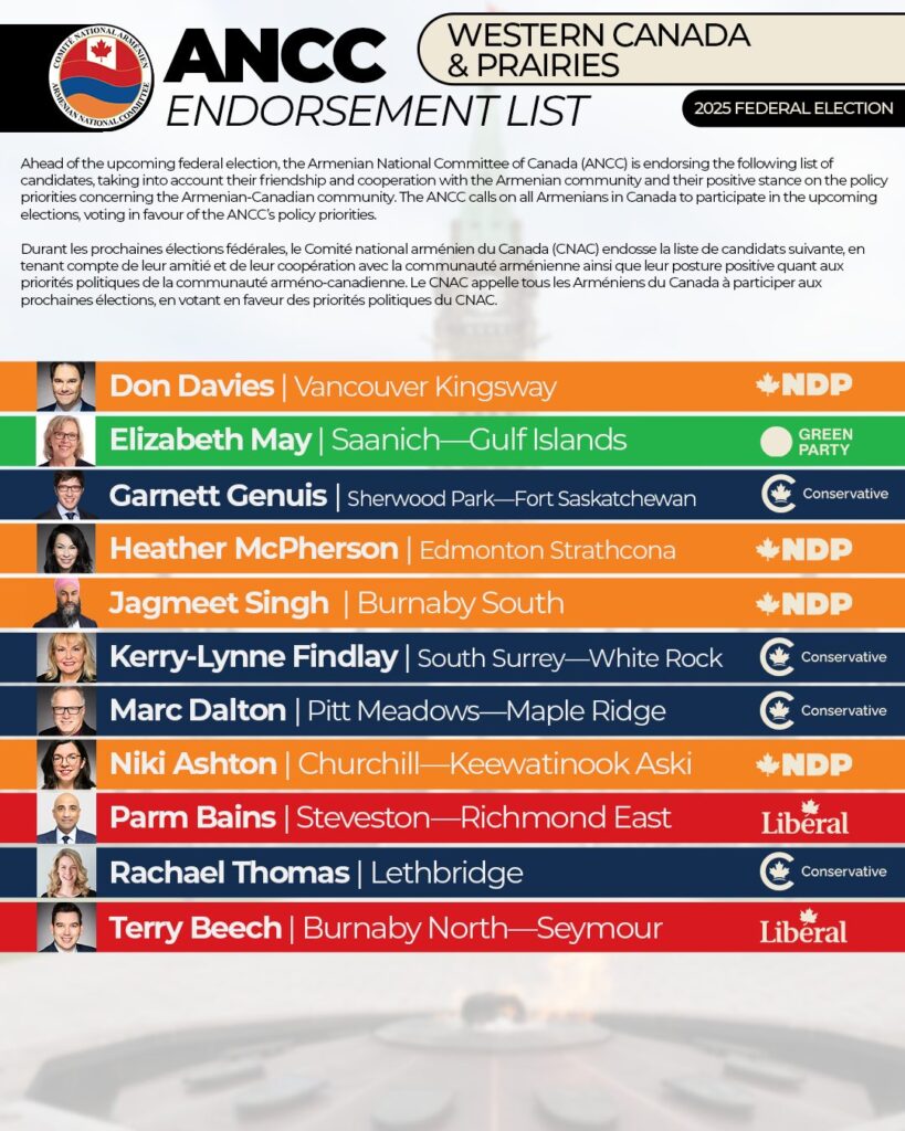 The Armenian National Committee of Canada Announces Endorsements Ahead of Federal Election 2025